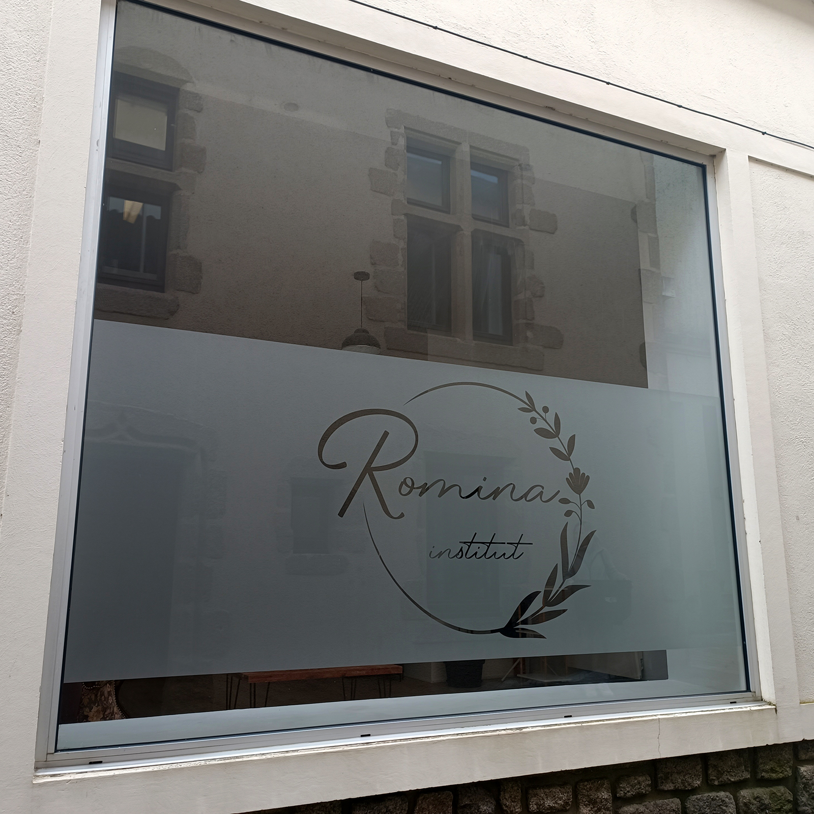 Réalisation de la vitrophanie en dépoli pour "ROMINA INSTITUT".